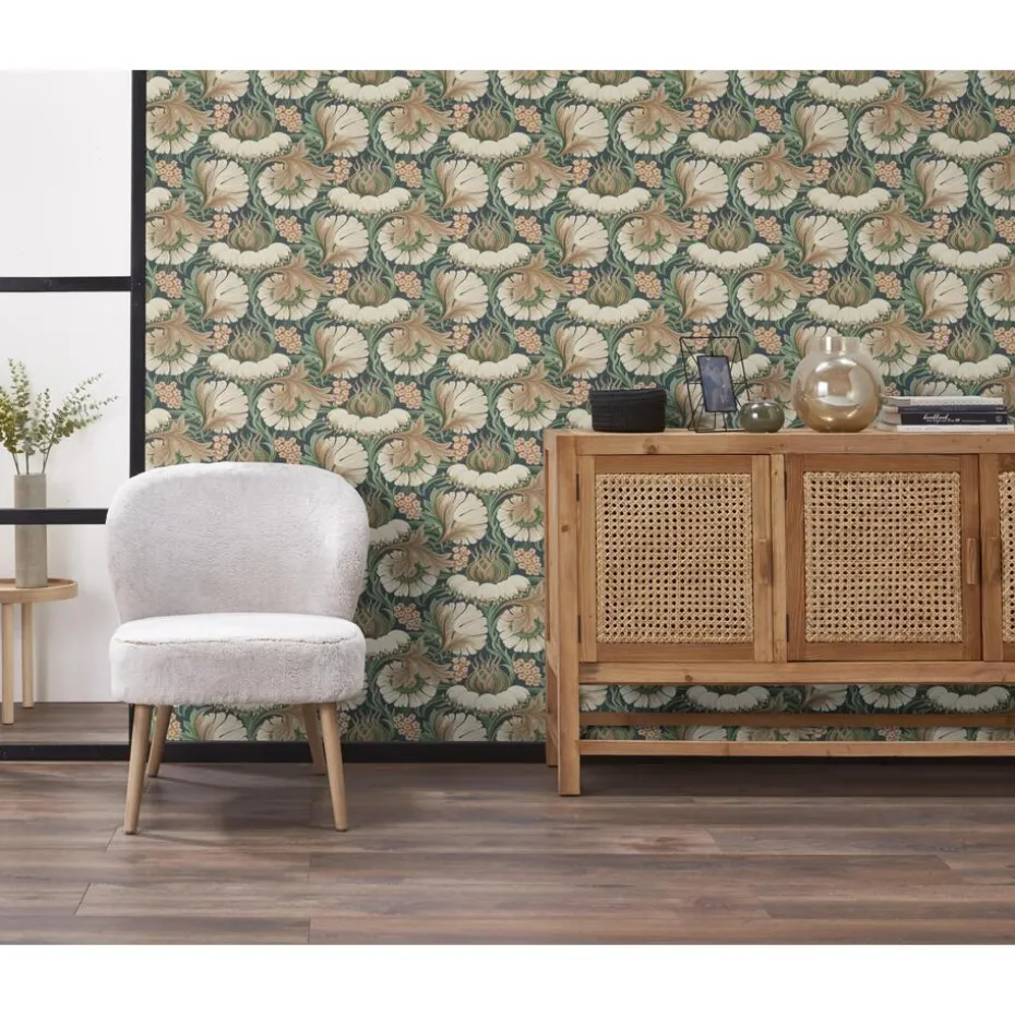 Behang Diede met een print van bloemen. Het behang is gemaakt van 100% cellulose en heeft een patroonhoogte van 53 centimeter.