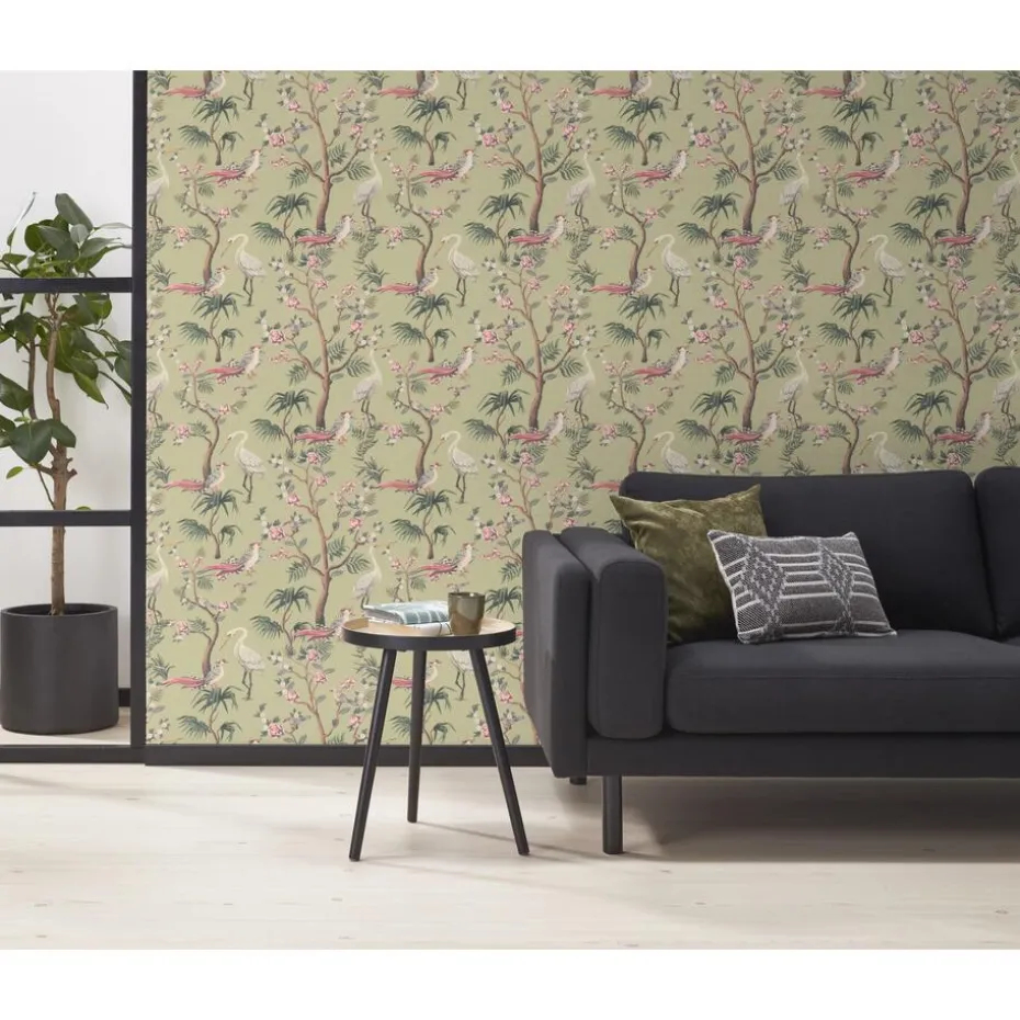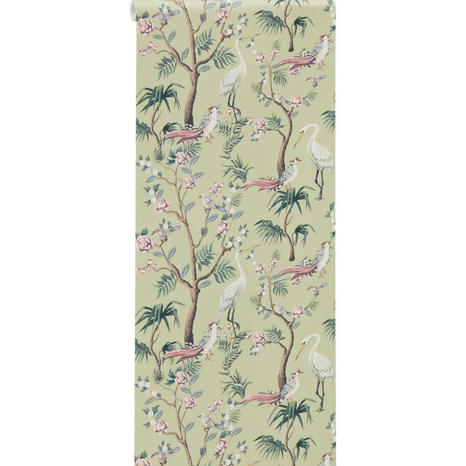 Behang Emma in de kleur groen. Gemaakt van 100% cellulose. 53cm breed en 53cm patroonhoogte.