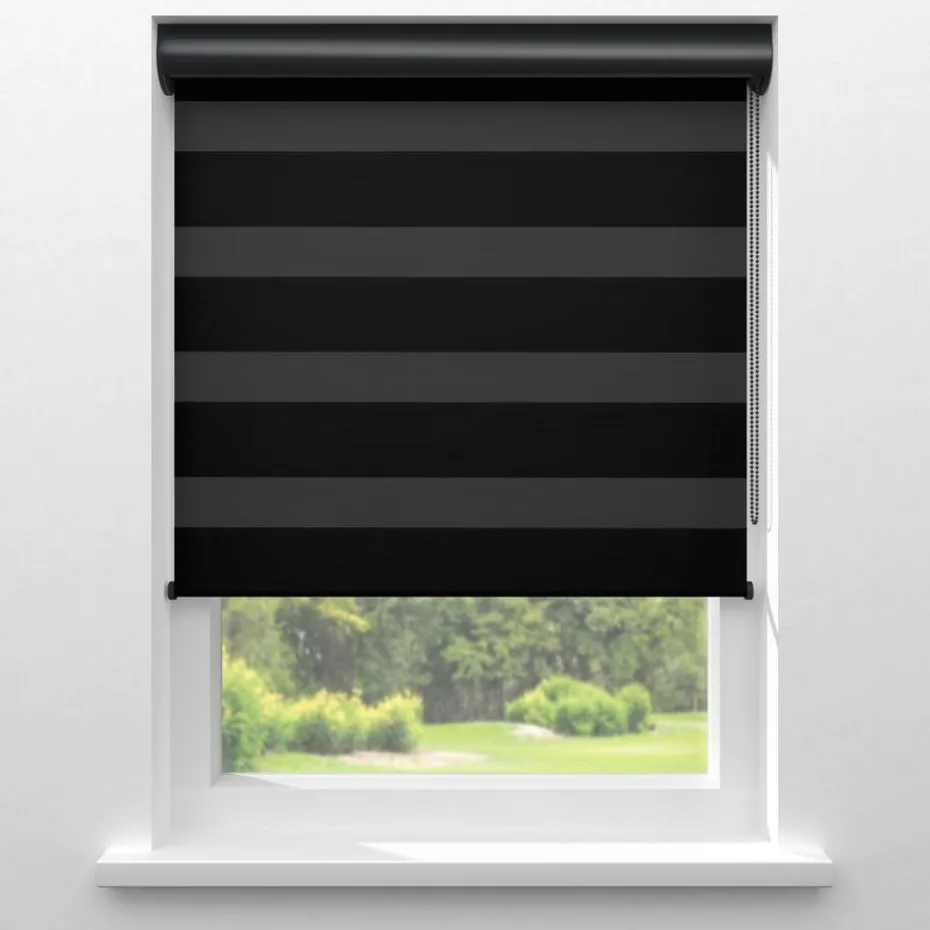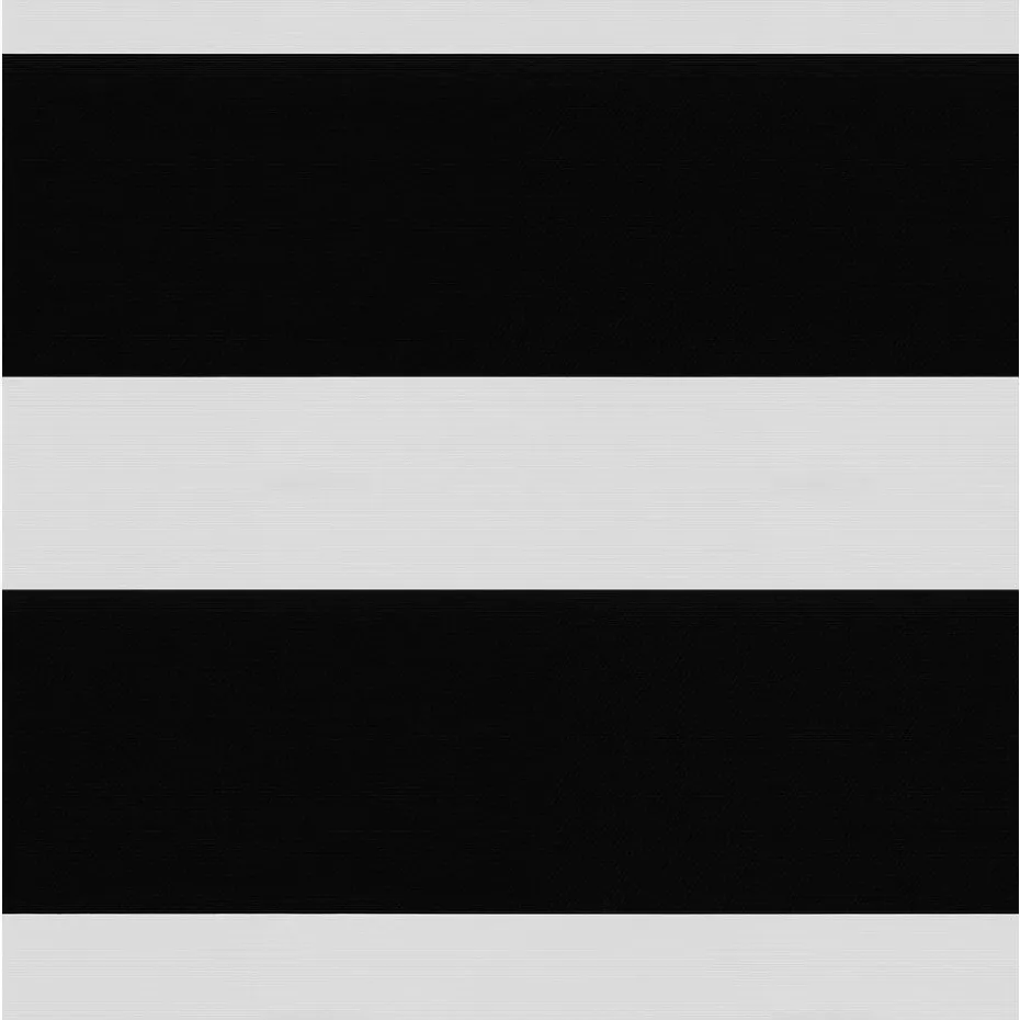 Verduisterend duo-rolgordijn zwart met lichte glans. De transparante banen hebben een fijne gaasstructuur. De afwisselende open en dichte stofbanen bewegen voor elkaar langs. Zo bepaal je eenvoudig de lichtinval en privacy. Met een handomdraai van een lichte naar een volledig verduisterende ruimte. Ideaal voor in de slaapkamer. Je kunt zelf de kleur kiezen van de cassettes, eindkappen, kettingen, onderlatten en roedes. De bedieningszijde kies je ook zelf: rechts of links. Op maat te maken en eenvoudig met de juiste afmetingen te bestellen. Dit duo-rolgordijn is 100% verduisterend. Toch kan het voorkomen dat er tussen de banen stof een minimale lichtinval plaatsvindt.