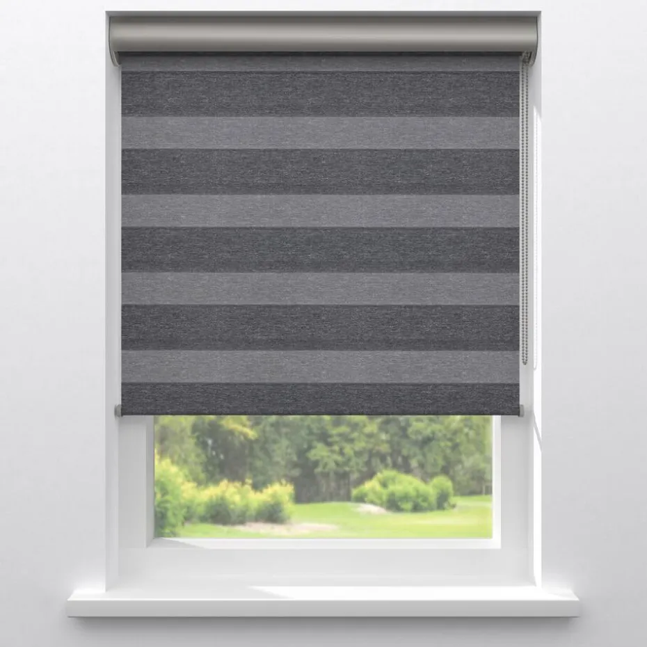 Lichtdoorlatend duo-rolgordijn donkergrijs gemêleerd. De transparante banen hebben een fijne gaasstructuur. De afwisselende open en dichte stofbanen bewegen voor elkaar langs. Zo bepaal je eenvoudig de lichtinval en privacy. Je kunt zelf de kleur kiezen van de cassettes, eindkappen, kettingen, onderlatten en roedes. De bedieningszijde kies je ook zelf: rechts of links. Op maat te maken en eenvoudig met de juiste afmetingen te bestellen.