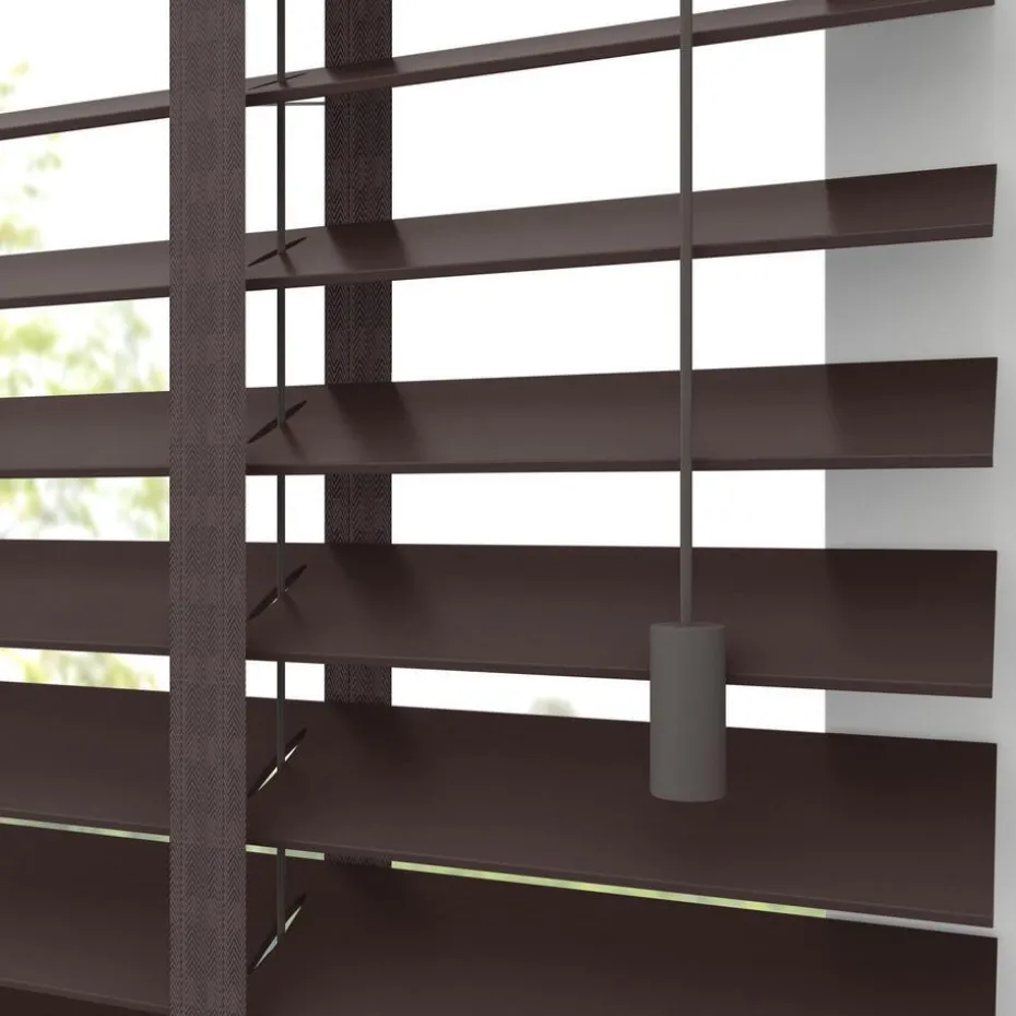 Houten jaloezie bruin met gelakte afwerking en lichte glans. 100% hout. De brede lamellen van 50 mm zorgen voor veel lichtinval en bieden veel privacy wanneer je deze sluit. Op maat te maken en volledig naar wens samen te stellen. Bepaal zelf de bedieningszijde en kies uit diverse accessoires en uitvoeringen. Keuze uit een bijpassend ladderkoord, 48 verschillende ladderbanden en een koordhanger van hout, rvs of zwart metaal.