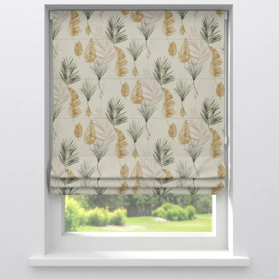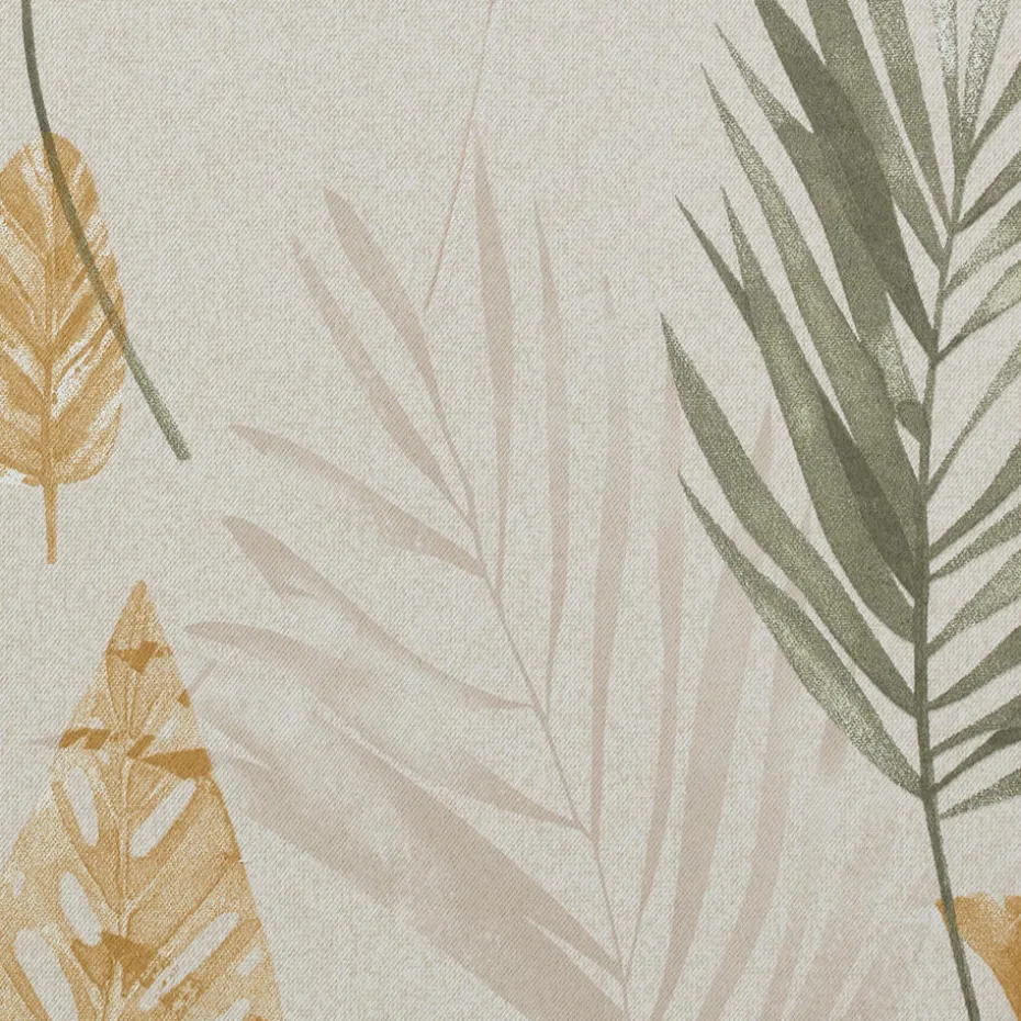Verduisterende gordijnstof met bladeren dessin. Soepelvallend, stevig en kreukherstellend. Deze dim-out gordijnstof is tot 95% verduisterend. De stof laat weinig daglicht door, maar houdt niet het volledige zonlicht tegen. 138 cm breed.