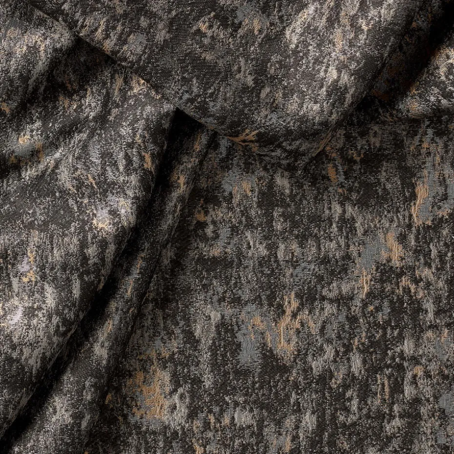 Lichtdoorlatende jaquard gordijnstof zwart met een verweerde metallic print. Stevig, vormvast en slijtvast. 145 cm breed.