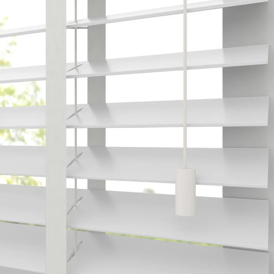 PVC houtlook jaloezie wit. Nauwelijks van echt hout te onderscheiden met de voordelen van PVC. Deze jaloezie is vochtbestendig en ook geschikt voor vochtige ruimtes zoals badkamers en keukens. De brede lamellen van 50 mm zorgen voor veel lichtinval en bieden veel privacy wanneer je deze sluit. De bedieningszijde is rechts en links is de tuimelzijde. Op maat te maken en standaard uitgevoerd met een ladderkoord en een bijpassende koordhanger.