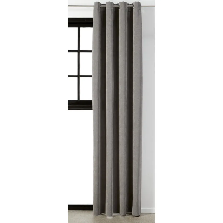 Kant en klaar ringgordijn van stevige grijze stof. Soepelvallend en kreukherstellend. 135 cm breed.