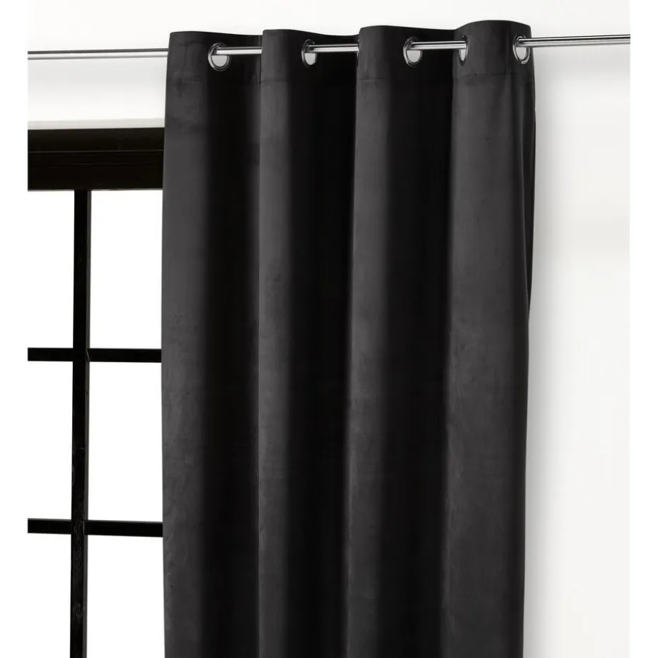 Kant en klaar ringgordijn van stevige zwartkleurige stof. Soepelvallend en kreukherstellend. 140 cm breed.