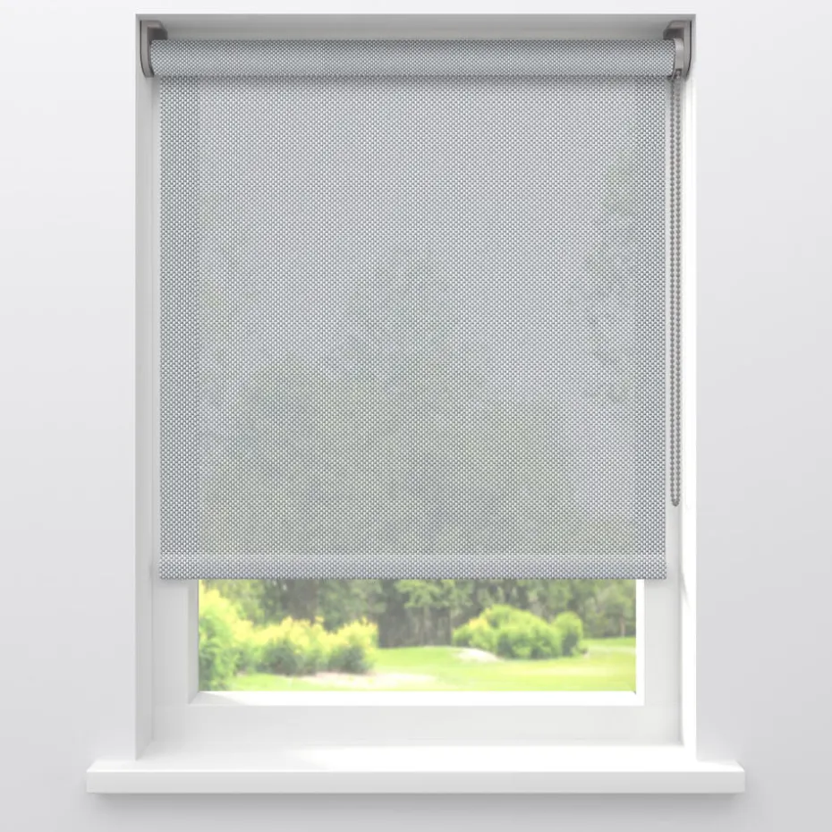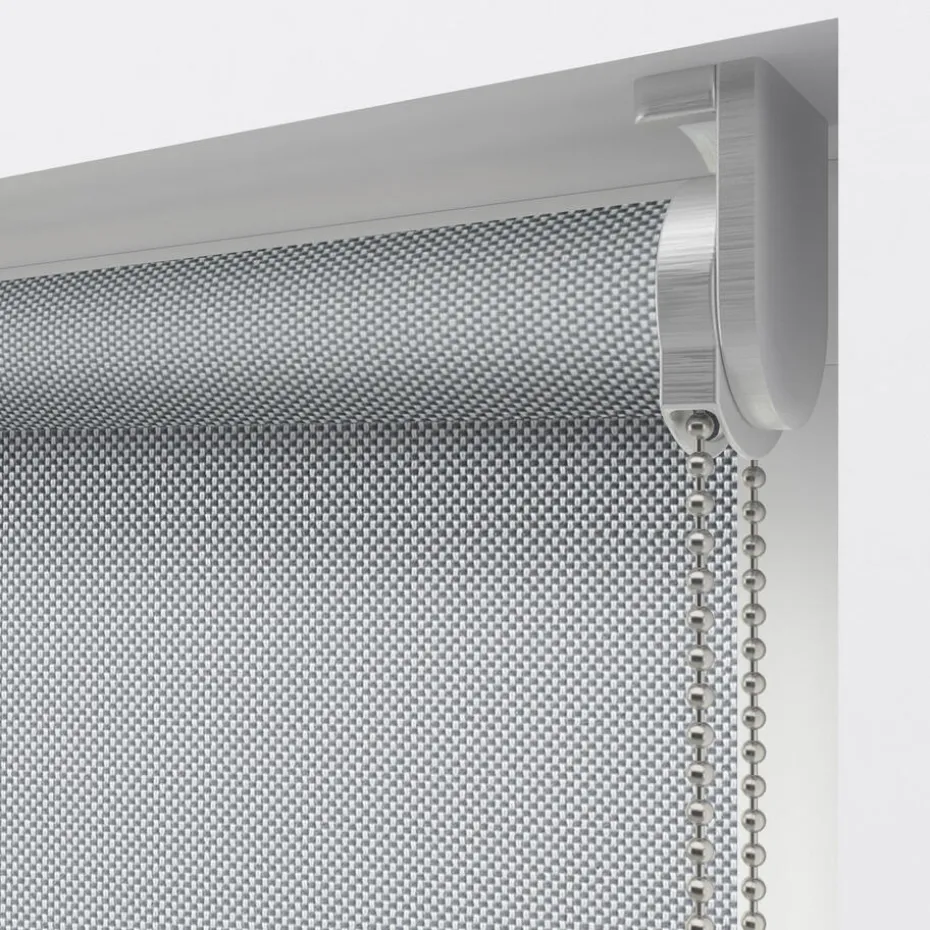 Screen rolgordijn Seb is grijs van kleur en lichtdoorlatend. Het materiaal bestaat uit glasvezeldraden met een PVC-coating. Hierdoor is de stof niet alleen sterk, maar filtert ook het zonlicht en blokkeert het inkijk. Dit systeem is alleen geschikt voor binnen gebruik en valt niet te monteren voor buiten het raam.