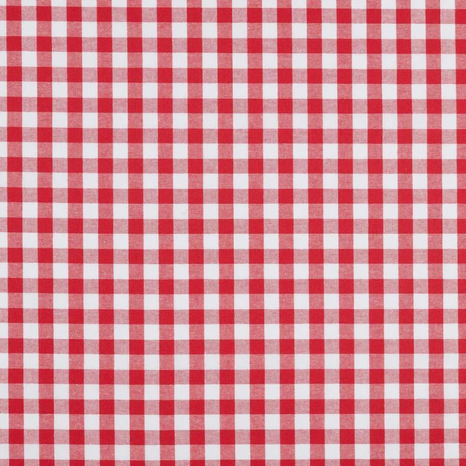 Stof met rood geruite opdruk. Stevig en slijtvast. Ook geschikt voor het maken van gordijnen.140 cm breed.
