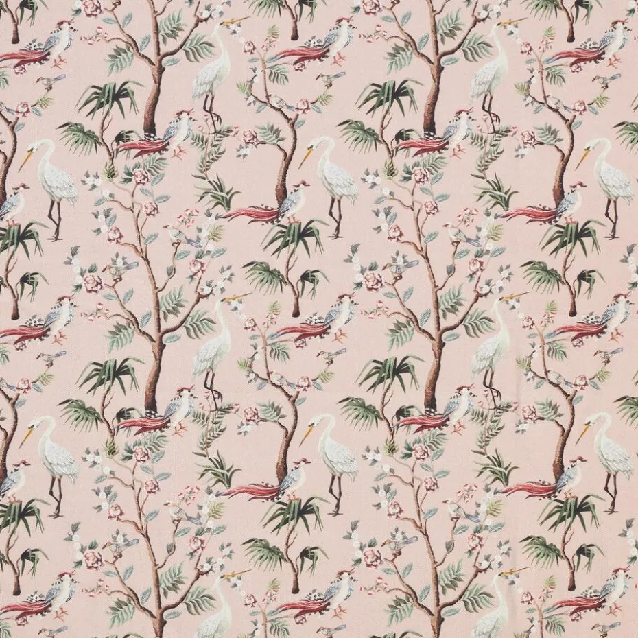 Gordijnstof roze met vogels. 100% katoen. Stevig en ademend. 140 cm breed.